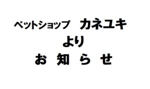 カネユキよりお知らせ おしらせ 2026/2/22 ペットショップ カネユキよりお知らせです。今月より営業時間の短縮を行っております。ペットトリミング、ペットホテルのご予約はなるべく午前中にお願いいたします。