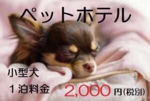 ペットホテル料金の変更 おしらせ 2026/3/12 2026年4月よりペットホテルの2泊目からの料金を小型犬1泊目同様の2,000円(税抜) 中型犬1泊目同様の3,000円(税抜)へ変更いたします。小型犬2,000円(税抜)×宿泊日数 中型犬3,000円(税抜)×宿泊日数となります。よろしくお願いいたします。